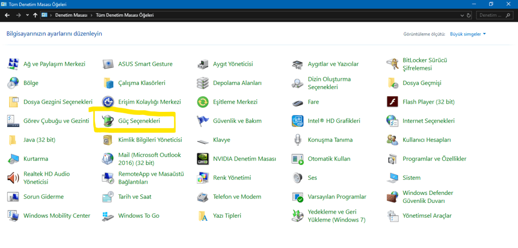 2)Denetim masasından “Güç Seçeneklerini” seçiyoruz.