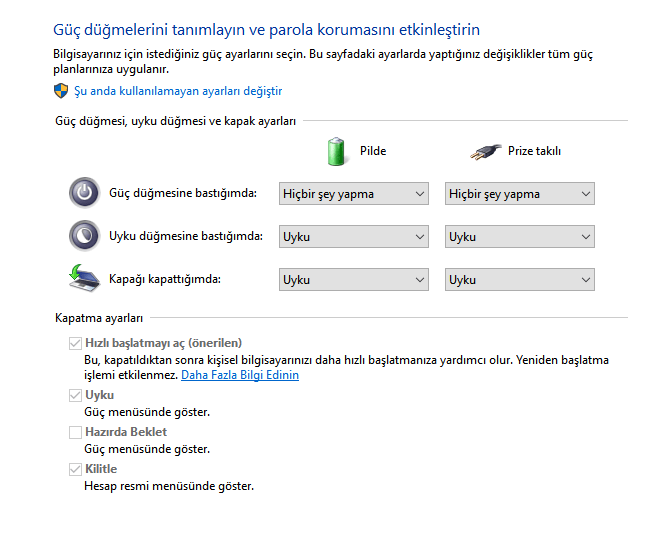 Bu ekrandan güç düğmesine basıldığında, Uyku düğmesine(uyku düğmesi yoksa bir şey etkilenmez) basıldığında ve kapak kapatıldığında olacakları (Hiç bir şey yapma, Uyku, Hazırda Beklet, Kapat, Ekranı kapat) seçebiliyoruz.