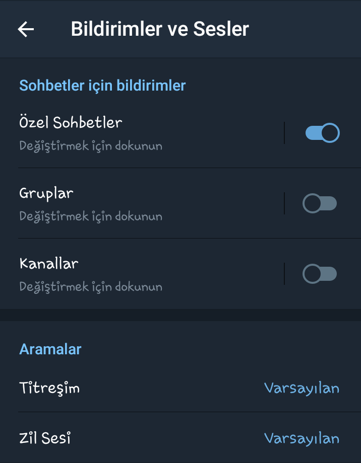 2-) Bildirimler ve Sesler ayarlarında çıkan yeri aşağıdaki gibi yaparsanız gruplar ve kanallardan gelen bildirimler cihazınıza gelmeyecek, sadece kişilerin özelden yazdığı mesajların bildirimleri cihazınıza gelecektir. Aramalar bölümünden de Telegram aramalarına özel zil sesi ve titreşim modeli ayarlayabilirsiniz.